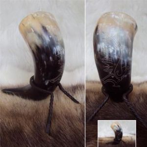 Leaf Pattern Drinking Horn With Brass Top & Iron Stand