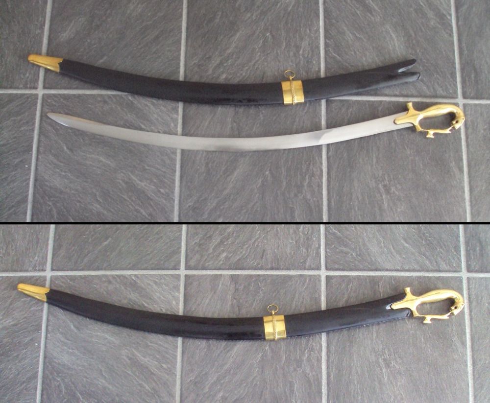 It has a solid brass lion hilt with brass fittings on the scabbard.