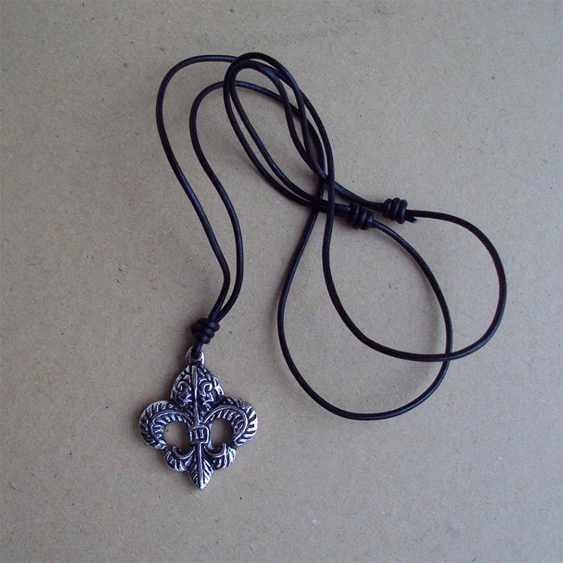 This small fleur de lis style pendant has a beautiful silver finish and leather adjustable cord for your neck. Making an excellent gift the pendant measures approx 4cm.