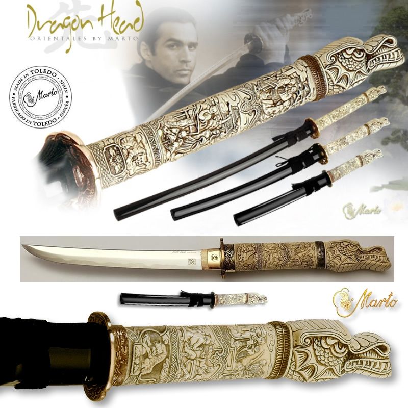 The Dragon Head Tanto by Marto of Toledo Spain features a black lacquered scabbard (saya) an intricately carved hilt like its big brothers the 417 Katana and 421 Wakizashi.